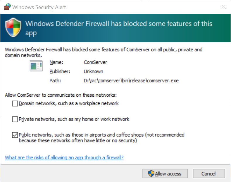 Enabling the firewall permission requires administrator privileges. However, as we only need to listen for connections via localhost we shouldn't need to modify the firewall so the dialog can be dismissed safely. However, going back to the COM client we'll see an error reported.