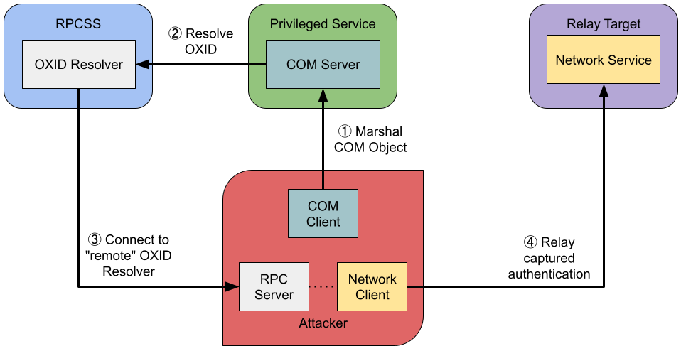 This isn't yet a privilege escalation, since you need to convince a privileged user to unmarshal the OBJREF. This was the second key insight: you could get a privileged service to unmarshal an arbitrary OBJREF easily using the CoGetInstanceFromIStorage API and activating a privileged COM service. This marshals a COM object, creates the privileged COM server and then unmarshals the object in the server's security context. This results in an RPC call to the fake OXID resolver authenticated using a privileged user's credentials. From there the authentication could be relayed to the local system for privilege escalation.