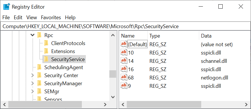 The key, shown in the above screenshot has a list of values. The value's name is the number assigned to the authentication service, for example 16 is RPC_C_AUTHN_GSS_KERBEROS. The value's data is then the name of the DLL to load which provides the API, for Kerberos this is sspicli.dll.