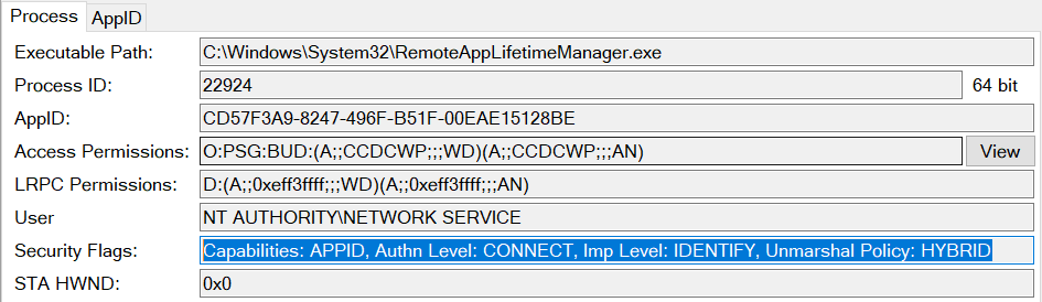 In the above code, we register to only receive Kerberos authentication and we can also specify an arbitrary SPN as I described in the previous blog post. One thing to note is that the call to CoInitializeSecurity will establish the connection to RPCSS and pass the executable filename. Therefore we need to modify the filename before calling the API as we can't change it after the connection has been established.