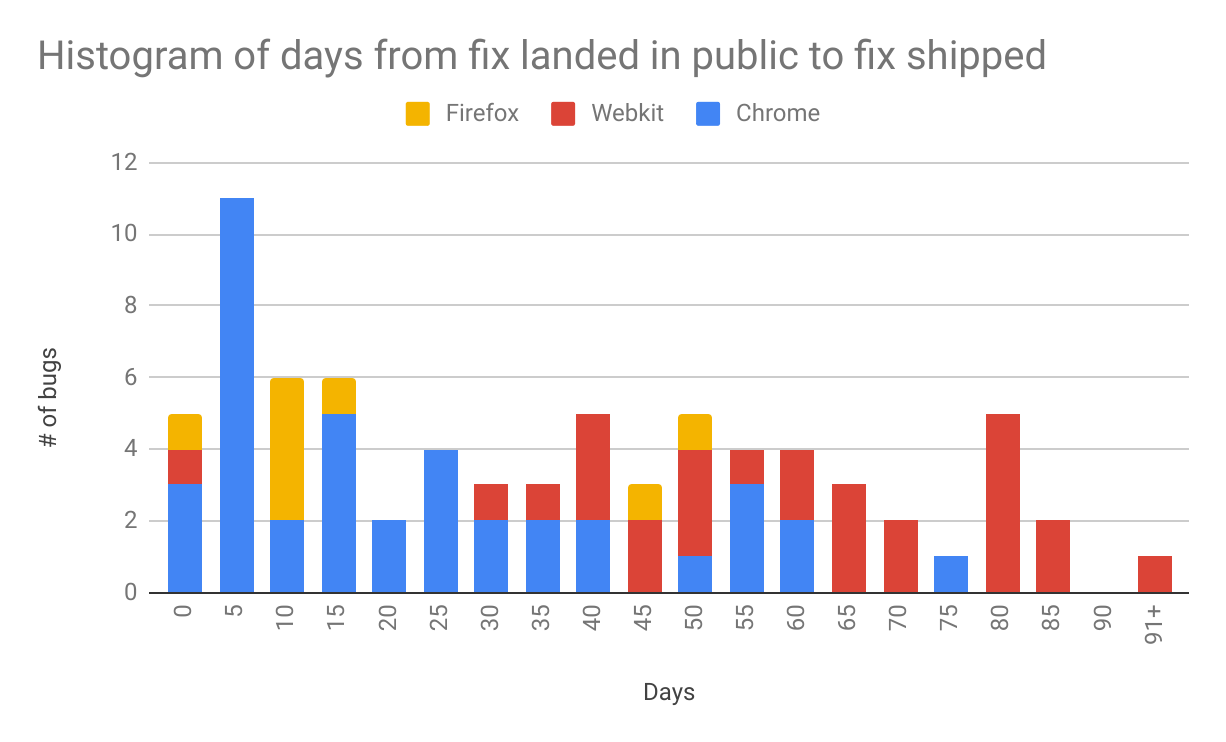 Chrome is currently the fastest of the three browsers, with time from bug report to releasing a fix in the stable channel in 30 days. The time to patch is very fast here, with just an average of 5 days between the bug report and the patch landing in public. The time for that patch to be released to the public is the bulk of the overall time window, though overall we still see the Chrome (blue) bars of the histogram toward the left side of the histogram. (Important note: despite being housed within the same company, Project Zero follows the same policies and procedures with Chrome that an external security researcher would follow. More information on that is available in our Vulnerability Disclosure FAQ.)