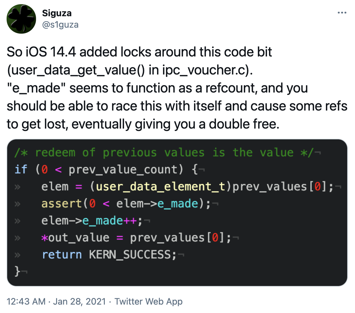 This blog post is my analysis of a vulnerability exploited in the wild and patched in early 2021. Like the writeup published last week looking at an ASN.1 parser bug, this blog post is based on the notes I took as I was analyzing the patch and trying to understand the XNU vouchers subsystem. I hope that this writeup serves as the missing documentation for how some of the internals of the voucher subsystem works and its quirks which lead to this vulnerability.