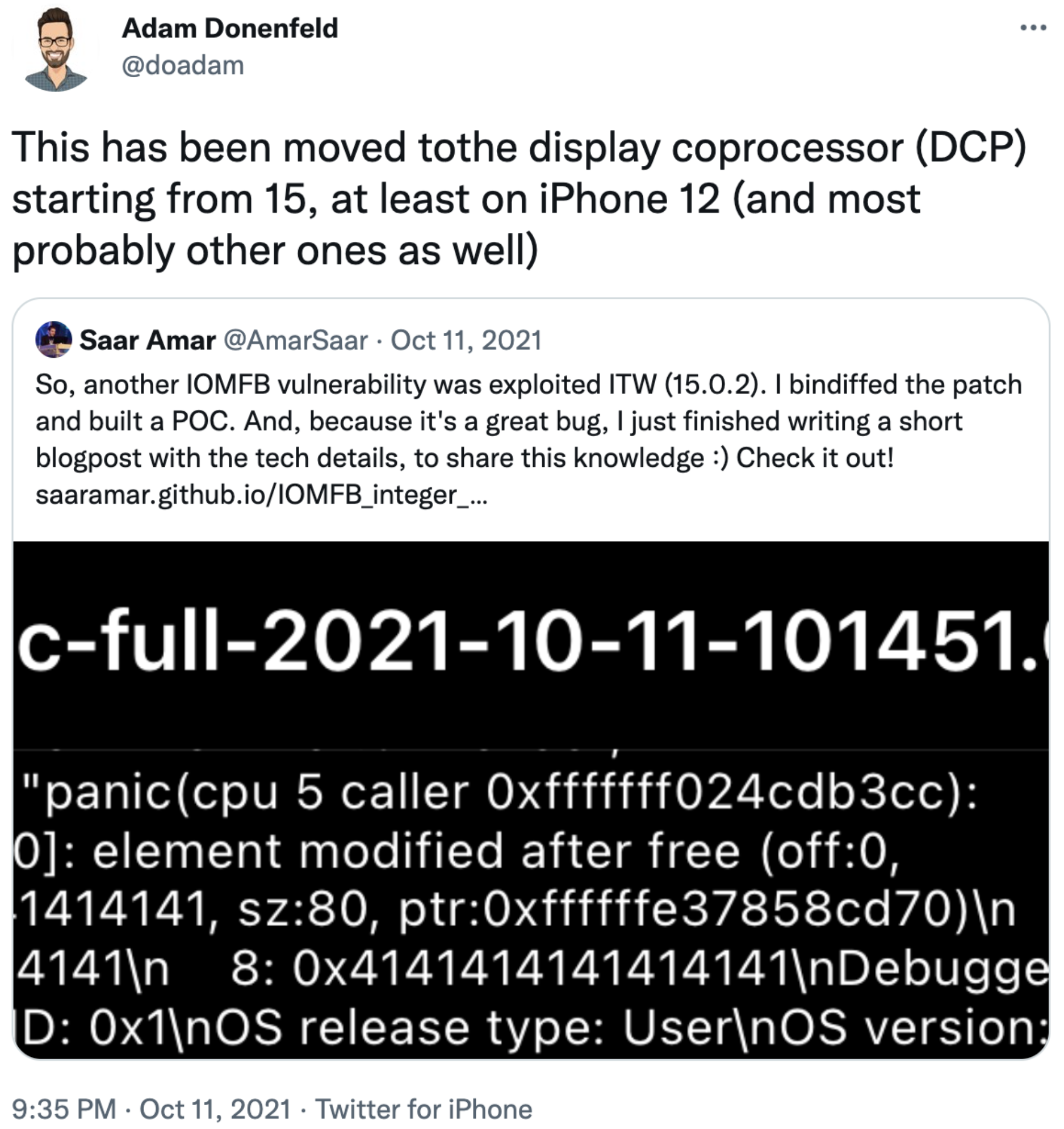 I've discussed in recent posts how attackers tend to be ahead of the curve. As the curve slowly shifts towards memory corruption exploitation getting more expensive, attackers are likely shifting too. We saw that in the logic-bug sandbox escape used by NSO and we see that here in this memory-corruption-based privilege escalation that side-stepped kernel mitigations by corrupting memory on a co-processor instead. Both are quite likely to continue working in some form in a post-memory tagging world. Both reveal the stunning depth of attack surface available to the motivated attacker. And both show that defensive security research still has a lot of work to do.