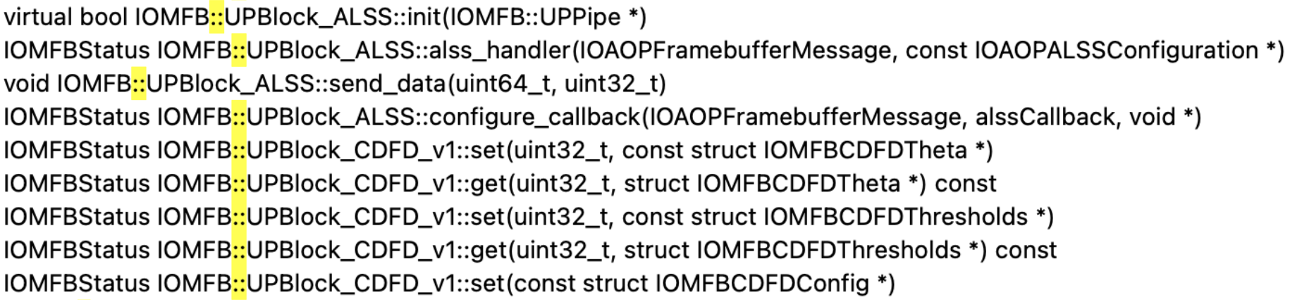 Effectively the implementation of the IOMobileFramebuffer user client has been moved on to the DCP and the external method interface is now a proxy shim, via shared memory, to the actual implementations of the external methods which run on the DCP.