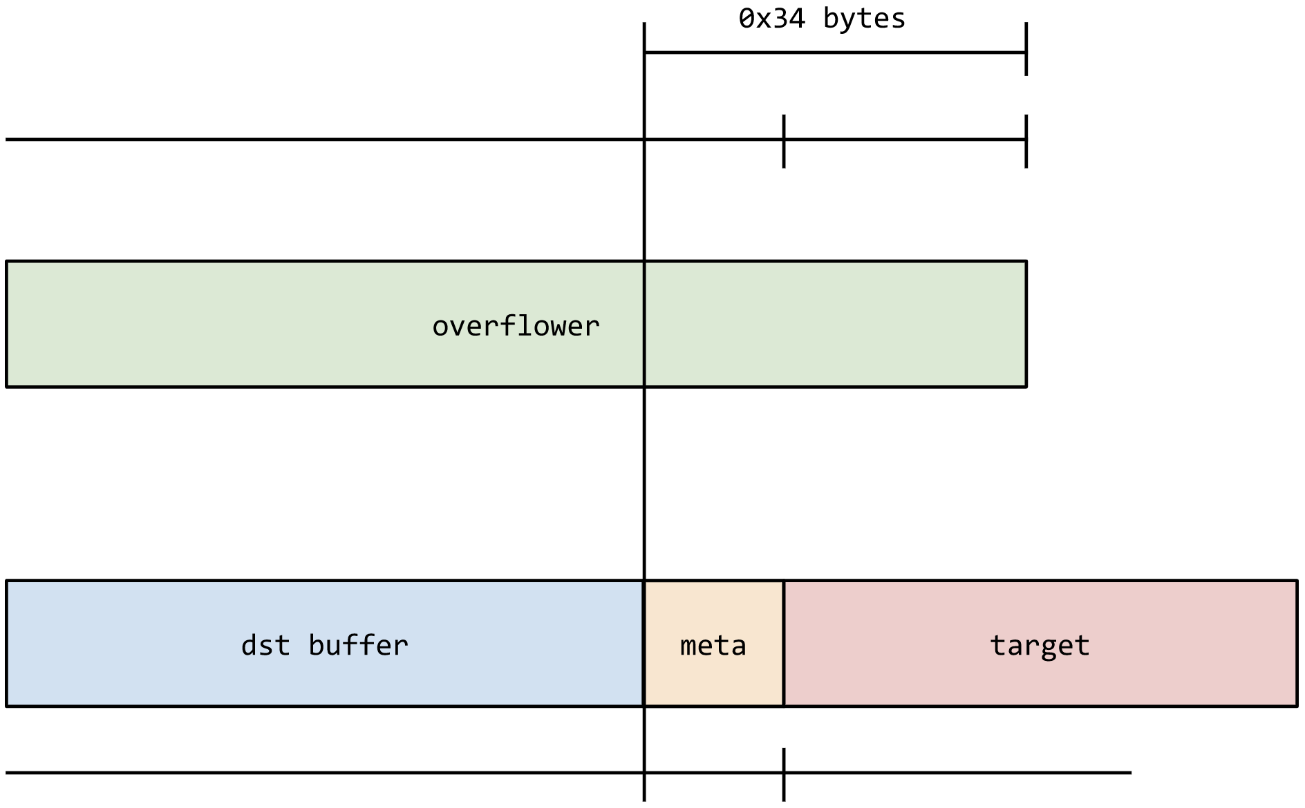 How much input is consumed? The input is fully consumed with no "rewinding" so it's 3*0x46*0x46*4 = 0xe5b0 bytes. Working backwards from the end of that buffer we know that the final 0x34 bytes of it go off the end of the 0xc608 allocation which means +0xe57c in the input buffer will be the first byte which corrupts the 8 metadata bytes and +0x8584 will be the first byte to corrupt the next object: