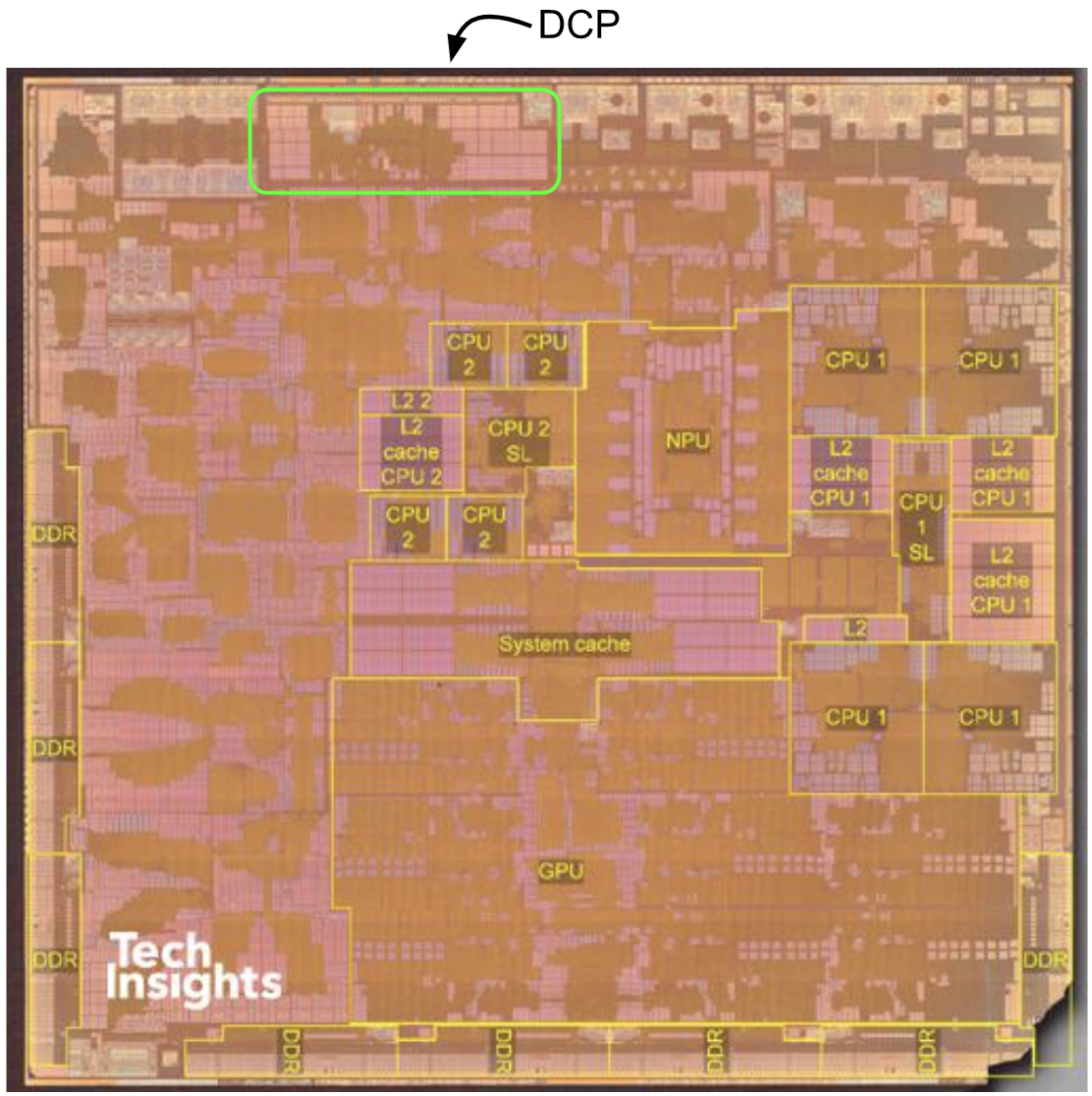 Companies like SystemPlus perform very thorough analysis of these dies. Based on their analysis the DCP is likely the rectangular region indicated on this M1 die. It takes up around the same amount of space as the four high-efficiency cores seen in the centre, though it seems to be mostly SRAM.