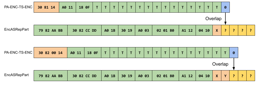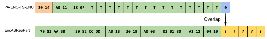 The diagram shows the ASN.1 DER structures for the timestamp and the start of the AS-REP. The values with specific hex digits in green are plain-text we know or can calculate as they are part of the ASN.1 structure such as types and lengths. We can see that there's a clear overlap between 4 bytes of known data in the timestamp with the first 4 bytes of the session key. We only need the first 5 bytes of the key due to the padding at the end, but this does mean we need to brute force the final key byte.