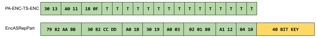 The diagram shows that currently there's no overlap between the timestamp, represented by the T bytes, and the 40 bit session key. However, we know or at least can calculate the entire DER encoded data for the AS-REP to cover the entire timestamp buffer. We can use this to calculate the keystream for the user's RC4-MD4 key without actually knowing the key itself. With the key stream we can encrypt a valid timestamp and send it to the KDC.
