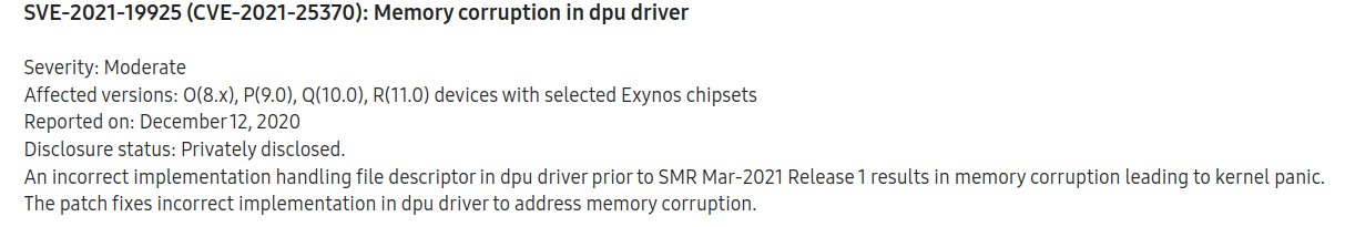 - Use-after-free in the Display Processing Unit (DPU) driver - CVE-2021-25370