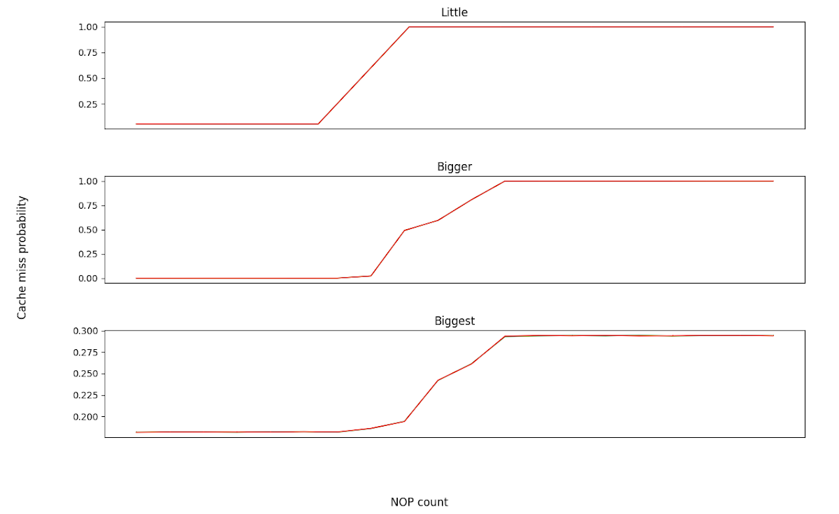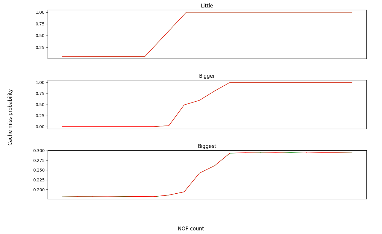The first graphs below show this data for a region of the x-axis (nop-count) on each core around where the speculation window ends (so the x-axis is anchored differently for each core), and on the y-axis we plot the observed probability that our measurement results in a cache-miss. Two separate lines are plotted in each graph; one in red for the "tag-check-fail" case and one in green for the "tag-check-pass" case. We can't really see the green line at all - the two lines overlap so closely as to be indistinguishable.