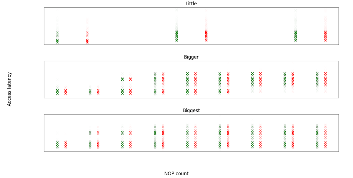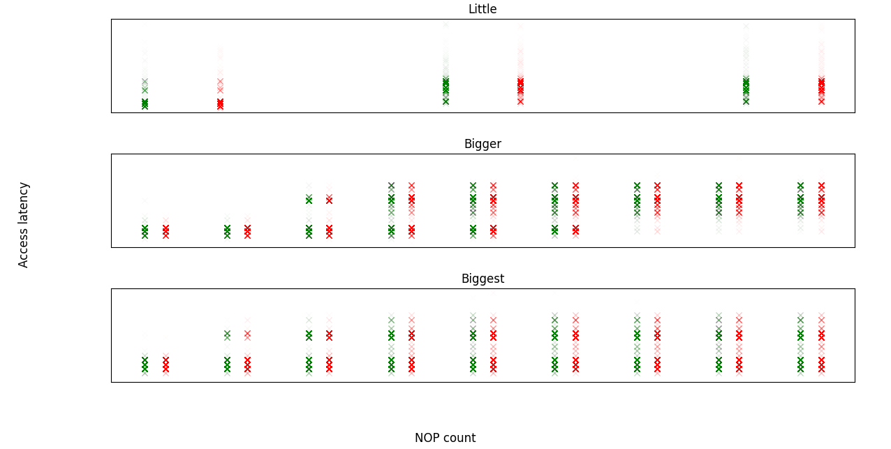 However, this approach adds more complexity to the measuring code, and more possibilities for smart prefetching or similar to interfere with our measurements. Since we are trying to test the properties of the hardware, rather than develop a practical attack that needs to run in a timely fashion, we decided to minimise these risks and instead collect enough data that we'd be able to see the patterns through the noise.