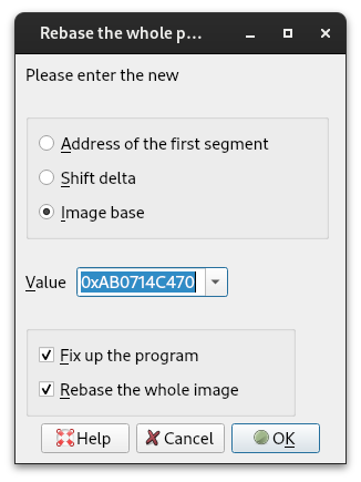 The following image shows rebasing of the kernel extension. This functionality is accessible in IDA via Edit->Segments->Rebase program… menu. When choosing the new base address, it is convenient to only change the high bits which makes it easy to manually convert rebased to original addresses and vice versa when needed. In the example below the image base was changed from 0xFFFFFE000714C470 to 0xAB0714C470.