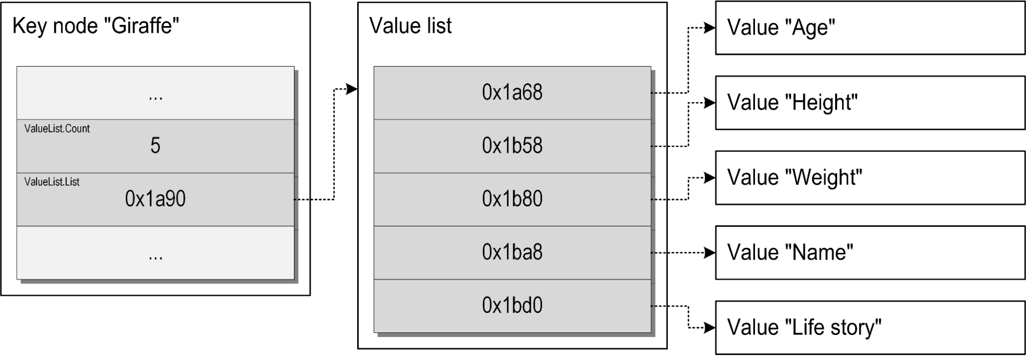 - Deletion of entire value list: if the descriptor of a value list (i.e. its cell index or length) are invalid, or if a symbolic link contains more than one value, the entire value list of the key is cleared.