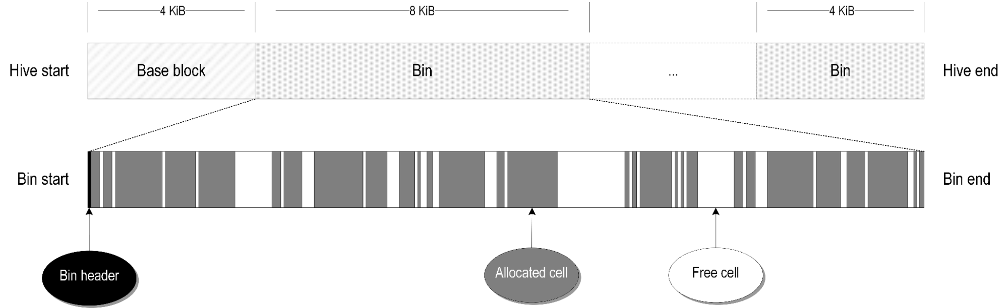 Bins in registry hives are a simple organizational concept used to split a potentially large hive into smaller chunks that can be mapped in memory independently of each other. Each of them starts with a 32-byte _HBIN structure: