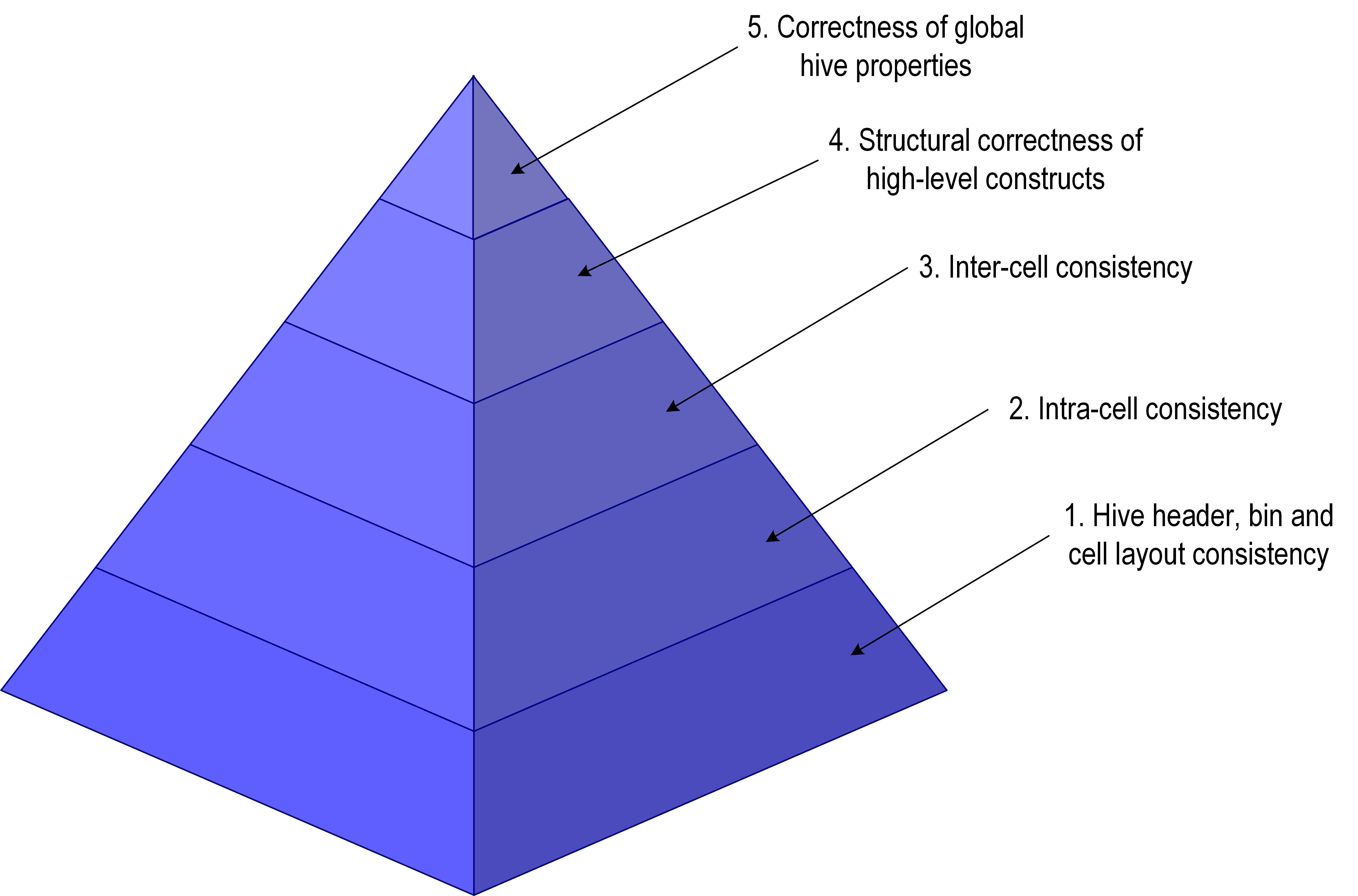 A generic function encompassing the verification of levels ≥ 2 of the pyramid, i.e. everything about the hive that defines its logical structure and is not related to memory management. If any self-healing occurs during the process, the function restarts its logic, so it may potentially take multiple iterations before a corrupted hive is fixed up and accepted as valid. |