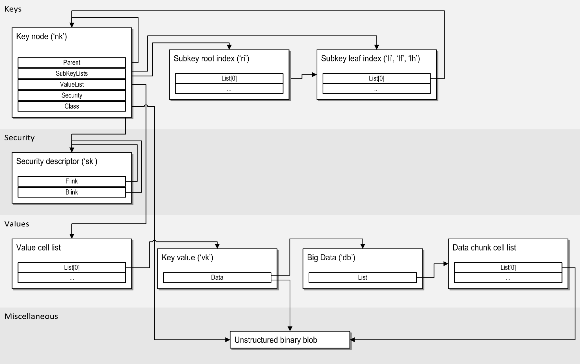 - Consistency between copies of redundant data in separate cells: e.g. _CM_KEY_NODE.SubKeyCounts[...] vs. the length of the subkey index.