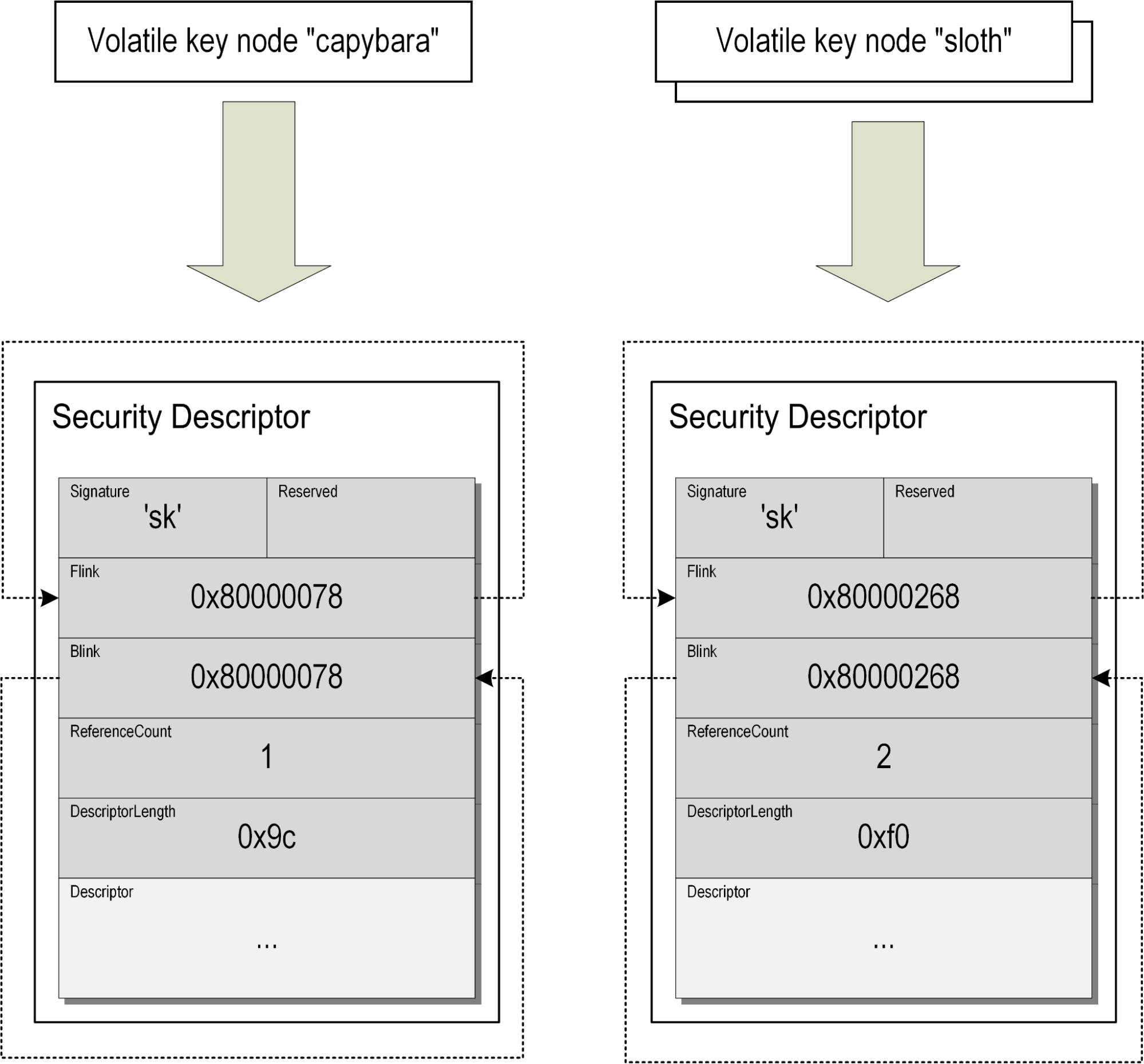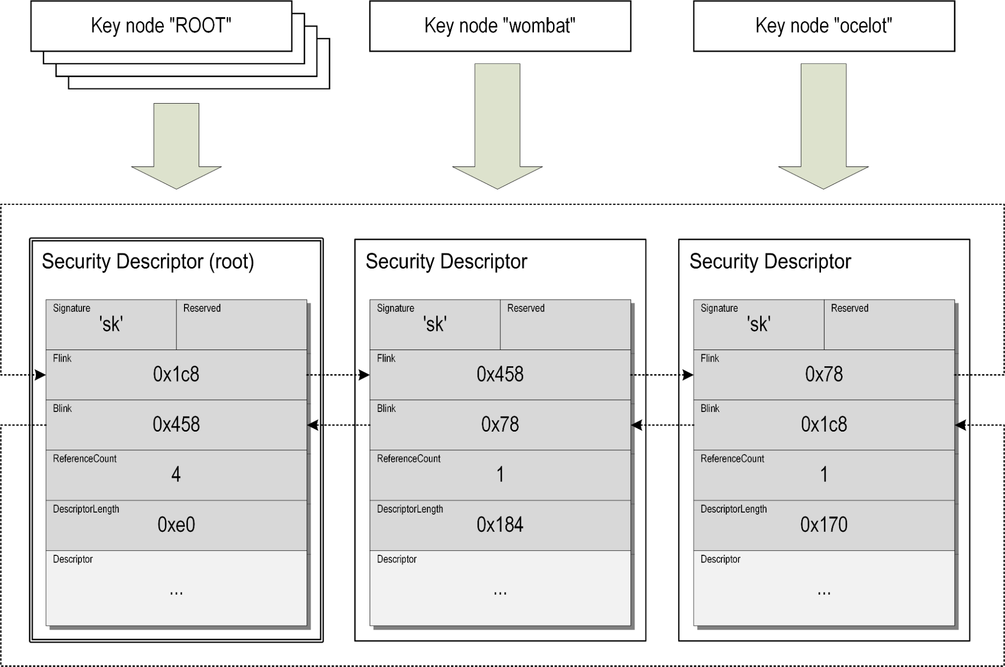 - Security descriptor list reset: if any errors are detected in the list of security descriptors (bad Flink/Blink indexes or invalid binary format), the set of descriptors in the hive is reduced to the single root descriptor, which will then be inherited by all the keys in the hive.