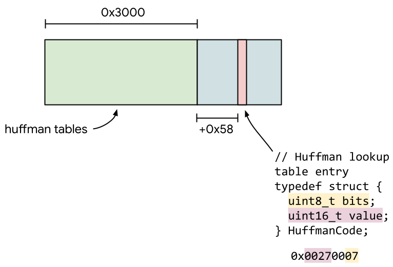 The second mystery involves the actual corruption primitive. The vulnerability will write a HuffmanCode structure at a known offset past the end of the huffman tables buffer: