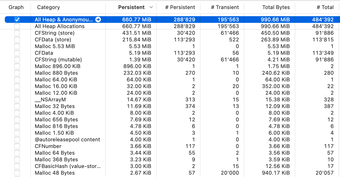 Parsing the single 5.5MB bplist causes nearly half a million allocations, churning through nearly a gigabyte of memory. Just looking through this allocation summary it's clear there's lots of CFString and CFData objects, likely used for heap shaping. Looking further down the list there are other interesting numbers: