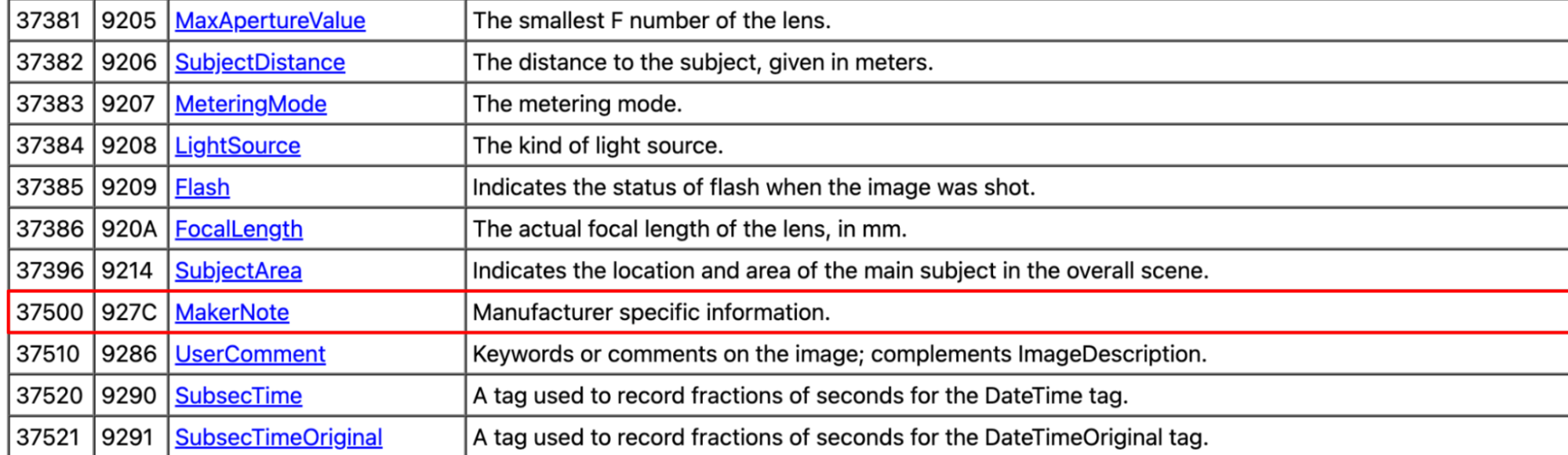 "the "MakerNote" tag contains information normally in a proprietary binary format."
