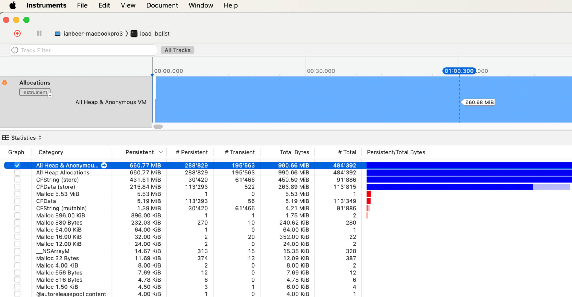 I wrote a small helper to load the bplist using the same API as the MakerNote parser and ran it using the Mac Instruments app: