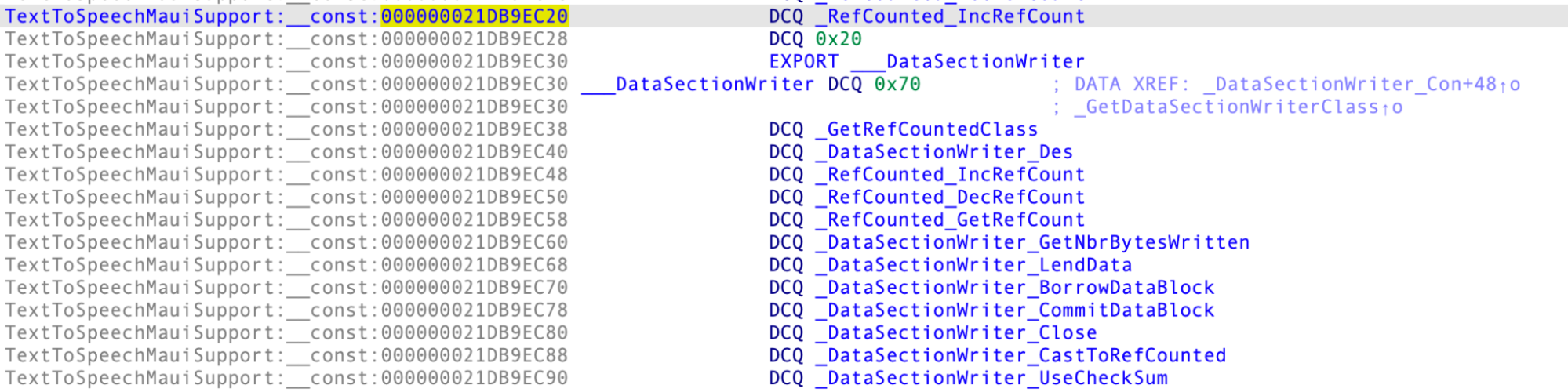 The next instruction adds 0x58 to that TextToSpeechMauiSupport pointer and reads a 64-bit value from there: