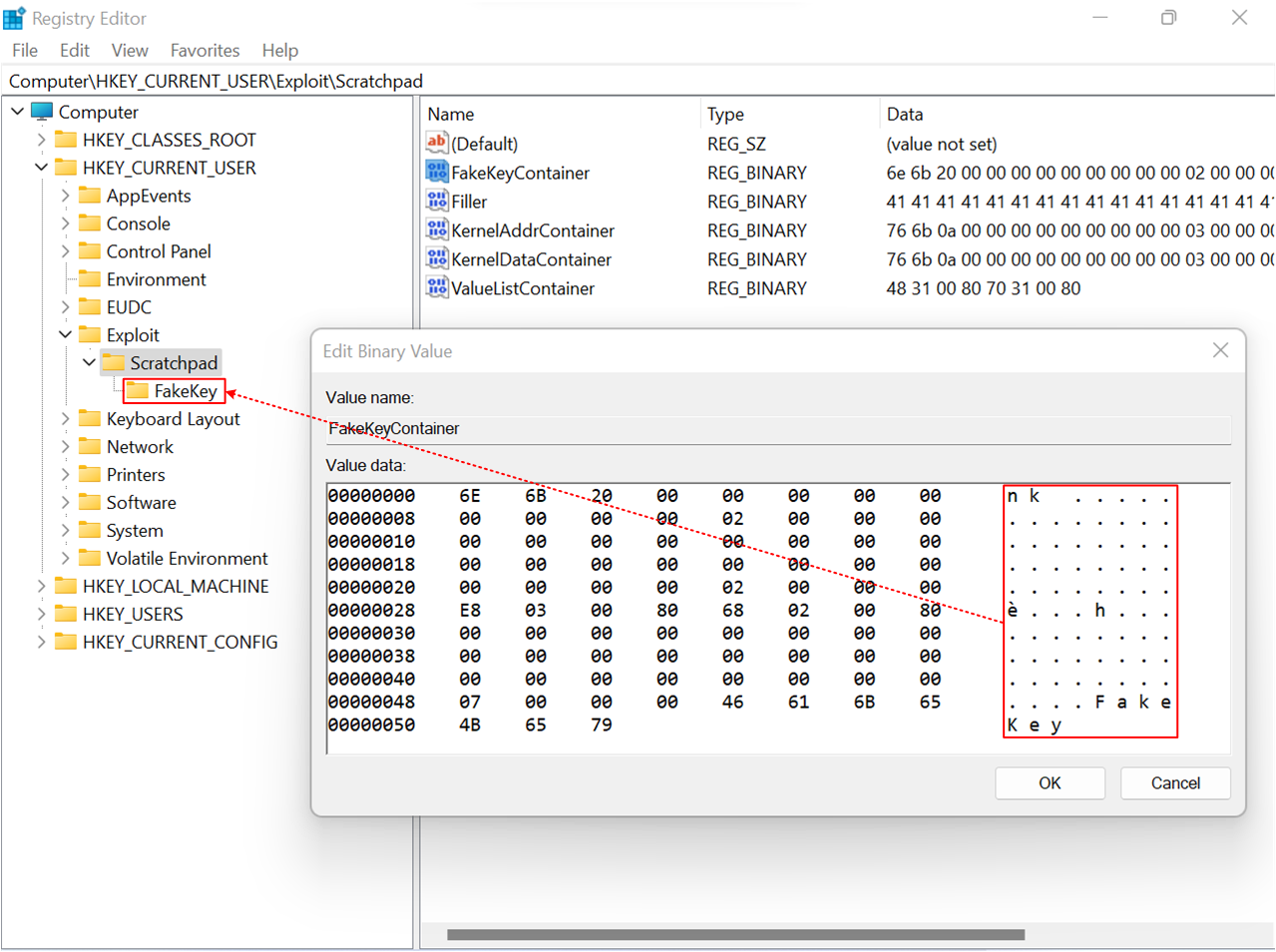 Of course, these are just conclusions drawn from writing a demonstration exploit, so I don't guarantee that the above flags are sufficient to maintain system stability in every configuration. Nevertheless, repeated tests have shown that it works in my environment, and if we subsequently set the data cell index of the controlled value back to 0xB2603000, and the Type/DataLength fields to something like REG_BINARY and 0x100, we should be finally able to see the following result in the Registry Editor: