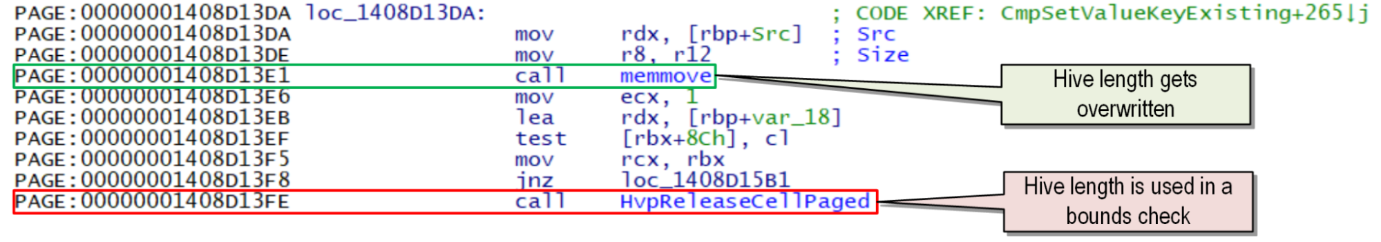 To better realize just how close the overwriting of the Length field is to its use in the bounds check, we can have a look at the disassembly of the CmpSetValueKeyExisting function, where this whole logic takes place.