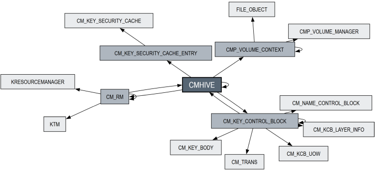 If we were to create a graphical representation of the relationships between structures based on the pointers they contain, starting from _CMHIVE, it would look something like the following: