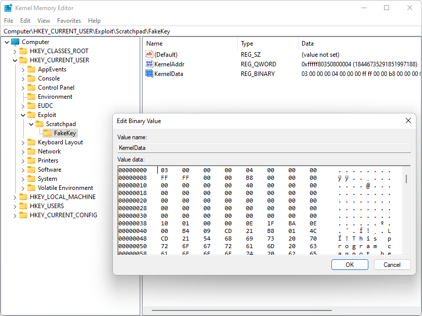 If not that, then what else? Experienced exploit developers would surely find dozens of different ways to complete the privilege escalation process. However, I had a specific goal in mind that I wanted to achieve from the start. I thought it would be elegant to create an arrangement of objects where the final stage of exploitation could be performed interactively from within Regedit. This brings us back to the selection of our two fake values, "KernelAddr" and "KernelData". My goal with these values was to be able to enter any kernel address into KernelAddr, and have KernelData automatically—based solely on how the registry works—contain the data from that address, available for both reading and writing. This would enable a very unique situation where the user could view and modify kernel memory within the graphical interface of a tool available in a default Windows installation—something that doesn't happen very often. 🙂
