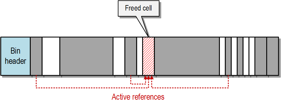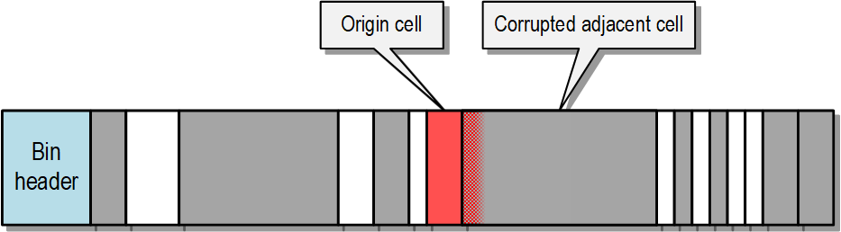 In this model, the second/third steps are achieved by finding another interesting object, arranging for it to be allocated near the overwritten buffer, and then corrupting it in such a way as to create a new primitive. However, in the case of hives, our options in this regard seem limited: we assume that we can fully control the representation of any cell in the hive, but the problem is that there is no immediately interesting data in them from an exploitation point of view. For example, the regf format does not contain any data that directly influences control flow (e.g., function pointers), nor any other addresses in virtual memory that could be overwritten in some clever way to improve the original primitive. The diagram below depicts our current situation:
