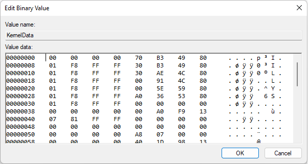 The data from both sources match, and the KernelData value displays them correctly without any additional offset. A keen observer will note that the expected "MZ" signature is not there, because I entered an address 4 bytes greater than the kernel image base. I did this because, even though we can "peek" at any virtual address X through the special registry value, the kernel still internally accesses address X-4 for certain implementation reasons. Since there isn't any data mapped directly before the ntoskrnl.exe image in memory, using the exact image base would result in a system crash while trying to read from the invalid address 0xFFFFF803507FFFFC.