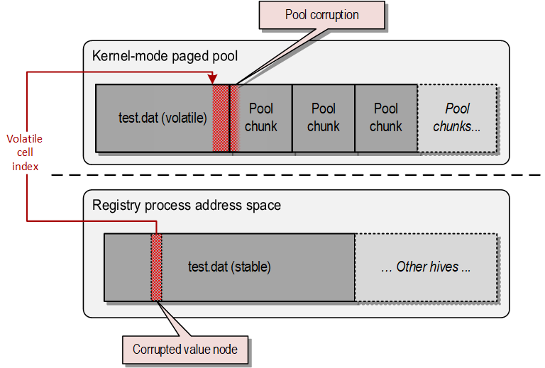 The first point is not useful to a potential attacker because these types of hives do not grant unprivileged users write permissions. The second and third points are also quite limited, as they could only be exploited through memory corruption that doesn't require binary control over the input hive. However, the fourth point makes it possible to exploit vulnerabilities in any hive in the system, including app hives. This is because creating volatile keys does not require any special permissions compared to regular keys. Additionally, if we have a memory corruption primitive within one storage type, we can easily influence data within the other. For example, in the case of stable storage memory corruption, it is enough to craft a value for which the cell index _CM_KEY_VALUE.Data has the highest bit set, and thus points to the volatile space. From this point, we can arbitrarily modify regf structures located in that space, and directly read/write out-of-bounds pool memory by setting a sufficiently long value size (exceeding the bounds of the given bin). Such a situation is shown in the diagram below: