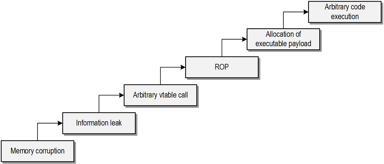 The task of the exploit developer is to fill in the gaps in this list, devising the intermediate steps leading to the desired goal. There are usually several such intermediate steps because, given the current state of security and mitigations, vulnerabilities rarely lead directly from memory corruption to code execution in a single step. Instead, a strategy of progressively developing stronger and stronger primitives is employed, where the final chain might look like this, for instance: